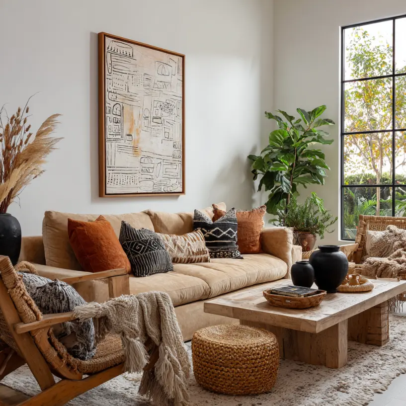 This series complements Mid-Century Modern, Contemporary Scandinavian, or Transitional interiors. The warm color palette and abstract nature pair well with wood furniture, natural textiles like linen and wool, and accents of black or brass. Display these pieces in a living room to create a focal point above a sofa, in a dining area for a touch of modern warmth, or in a hallway to add visual interest. Incorporate organic shapes in decor, such as round coffee tables or curved lamps, to echo the artwork's forms. Dried grasses or terracotta vases can further enhance the earthy and natural connection.
